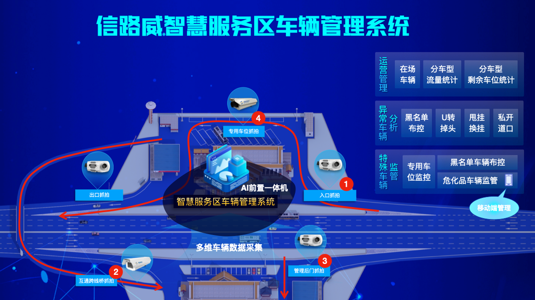 信路威智慧服務(wù)區(qū)車輛管理系統(tǒng),通過(guò)在服務(wù)區(qū)入出口匝道、內(nèi)部互通通道、專用車位等位置部署智能識(shí)別一體機(jī),實(shí)現(xiàn)對(duì)服務(wù)區(qū)所有通道的車流全覆蓋識(shí)別,精準(zhǔn)采集通行車輛的多維數(shù)據(jù);同時(shí)運(yùn)用公眾號(hào)/小程序等實(shí)現(xiàn)對(duì)?;返溶囕v進(jìn)行無(wú)紙化管理;對(duì)異常車輛進(jìn)行分析處理,在服務(wù)區(qū)入出口抓拍,深挖貨車換掛、貨車換牌的違法行為,對(duì)在服務(wù)區(qū)內(nèi)的U轉(zhuǎn)行駛、私開(kāi)道口等可疑逃費(fèi)行為進(jìn)行全景監(jiān)管,為高速收費(fèi)稽核提供服務(wù)區(qū)關(guān)鍵節(jié)點(diǎn)的輔助核查數(shù)據(jù)。