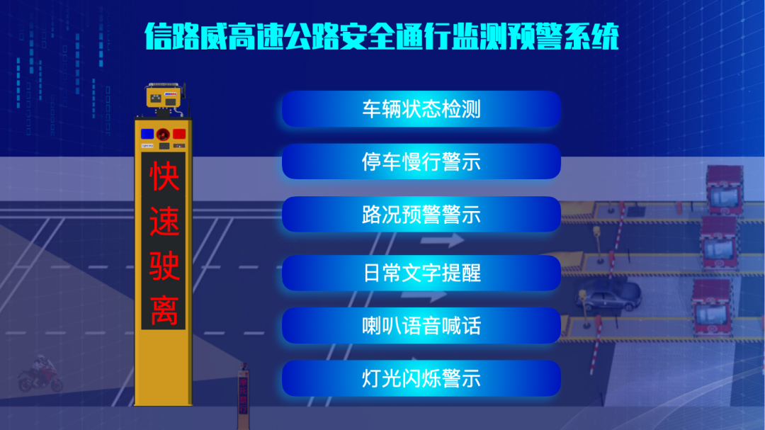 信路威以AI賦能,助力高速公路安全通行,推出高速公路安全通行監(jiān)測(cè)預(yù)警系統(tǒng),在分流匝道路口、匯入匝道路口、隧道、下坡、彎道、雨雪霧等重點(diǎn)路段部署智能設(shè)備“高速哨兵”,可實(shí)現(xiàn)車輛狀態(tài)檢測(cè)、停車慢行警示、路況預(yù)警警示 、日常文字提醒、喇叭語(yǔ)音喊話、燈光閃爍警示等功能,降低了高速公路事故率和死亡率,為高速行車安全風(fēng)險(xiǎn)進(jìn)行預(yù)警和提醒。
